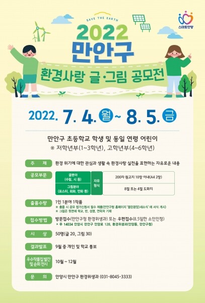 김산호 만안구청장은“이번 공모전이 어린이들에게 환경보전의 중요성에 대한 올바른 인식과 실천의 계기를 심어주는 환경사랑을 향한 소중한 디딤돌이 되길 희망한다”고 말했다.