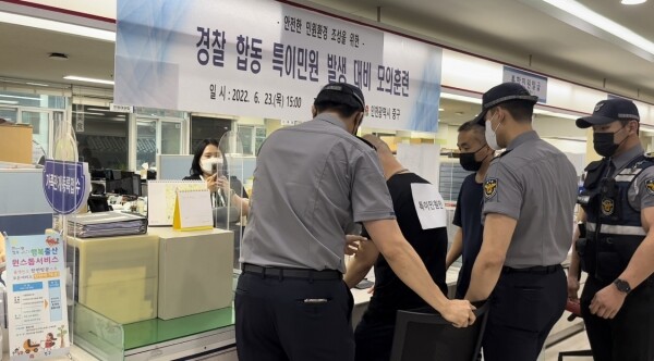 이날 특이민원 상황을 가정해 민원인 설득과 중재 비상벨 작동 및 청원경찰 호출 민원인 및 직원 대피 특이민원 제압 및 경찰 인계 순서로 진행됐다.