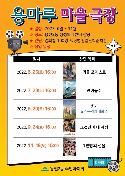 엄정산 용현2동 주민자치회장은 “문화복지분과에서 열심히 준비한 용마루 마을 극장이 문을 열게 돼 기쁘다”며 “가족, 친구들과 바로 집 앞에서 재미있는 영화를 즐기고 동네 이웃들과 서로 이야기 나누며 즐거운 시간을 보냈으면 좋겠다”고 말했다.