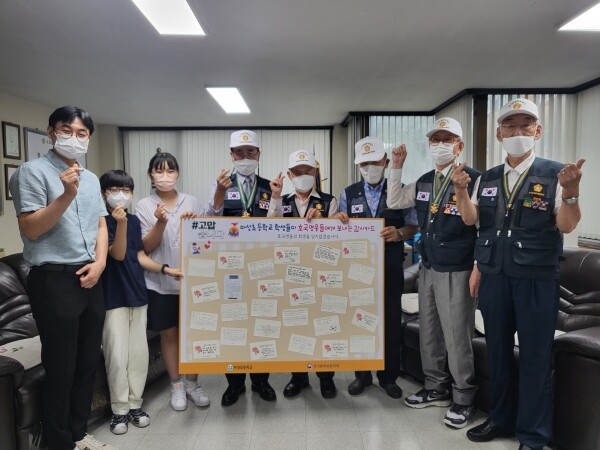 감사엽서는 용인시에 위치한 마성초등학교 학생들이 6월 호국보훈의 달을 맞아 호국영웅들의 희생에 대한 고마운 마음을 담아 작성했으며이날 김선광 교사와 김건우, 정아인 학생이 대표로 참석해 6.25참전유공자회 용인시지회 서귀섭 지회장 등 참전유공자분들에게 전달했다.