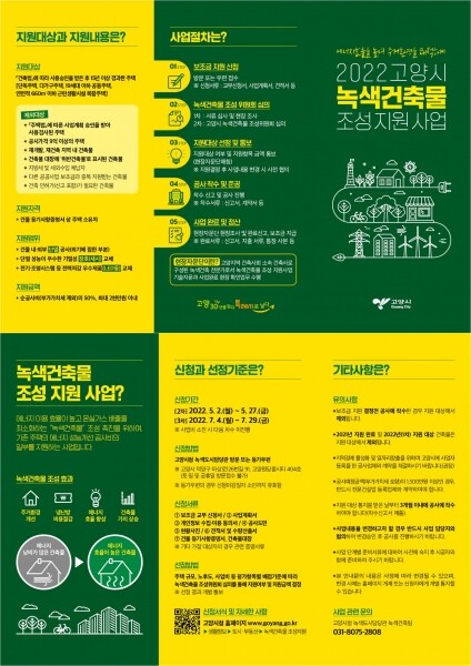 지원을 희망하는 대상 건축물 소유자는 고양시 홈페이지 공고 및 새소식에 첨부된 관련서류를 내려 받아 작성 후 고양시청 녹색도시담당관 녹색건축팀으로 7월 4일부터 7월 29일까지 방문 또는 등기 우편으로 제출하면 된다.