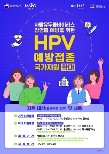 HPV 예방접종 무료 지원 대상은 기존 만12세 여성 청소년에서 올해3월부터 만 13~17세 여성청소년과 만 18~26세 저소득층 여성으로 확대됐다.
