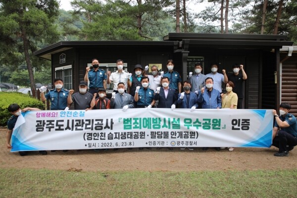 인증절차는 광주경찰서 범죄예방진단팀이 관리운영체계, 영역성, 활동성, 안전시설 등 15개 항목을 정밀 진단 후 총점의 90%이상 충족 시 범죄예방 우수공원으로 인증 받게 되는데, 금회 진단결과 자연감시 유도를 위한 수목전정 및 시설배치 112신고 노면 표지 등을 통한 관리운영체계 강화 몰래카메라 등 범죄피해 방지를 위한 공원 화장실 안심스크린 설치 등을 통해 평균 95.3점을 획득해, 우수한 점수로 ‘범죄예방 우수공원’인증을 받게 됐다.