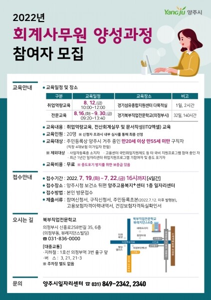 교육은 오는 8월 12일 경기섬유종합지원센터에서 취업역량교육을 시작으로 8월 16일부터 9월 30일까지 총 32일 140시간에 걸쳐 전산회계·ITQ엑셀 등을 의정부시 의정부동 소재 경기북부직업전문학교에서 진행한다.