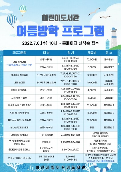 어린이도서관 여름방학 프로그램은 7월 6일 수요일 10시부터 이천시통합도서관 홈페이지를 통해 선착순으로 접수 후 참여할 수 있다.