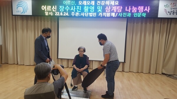 사진과 인문학 회원들은 그간 장수 사진을 찍을 기회가 없었던 고령의 어르신을 대상으로 사진 촬영을 도왔고 구월1동 지역사회보장협의체는 지역연계사업의 일환으로 장수 사진에 참여한 어르신들에게 삼계탕을 제공했다.