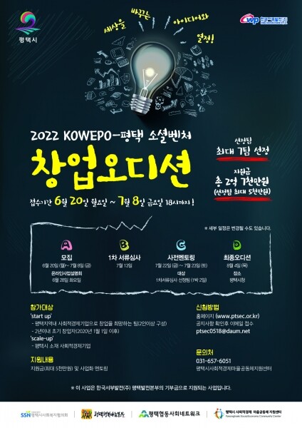 평택시, 한국서부발전평택발전본부, 평택시사회복지협의회, 평택행복나눔본부, 평택시사회적경제마을공동체지원센터가 공동으로 추진하는 이번 오디션은 올해 2회째를 맞는 사업으로 시, 지역사회의 공공기관, 중간지원조직 등이 함께해 지역사회 문제를 해결하고 성장하는 진정한 협업의 가치와 중요성을 보여주는 매우 우수한 모범 사례이다.