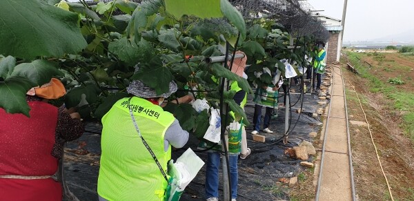 자원봉사자 19명은 포도농가에서 포도봉지를 씌우며 일손을 도왔다.