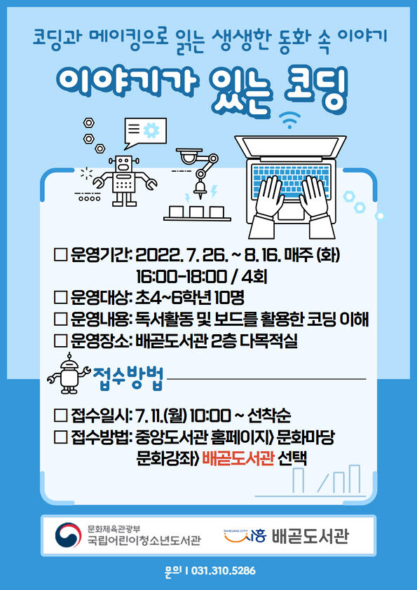 배곧도서관 관계자는 “도서관에서만 체험할 수 있는 독서와 연계된 코딩수업을 통해 새로운 독후활동을 체험하고 확장된 독서의 경험을 할 수 있길 바란다”고 전했다.