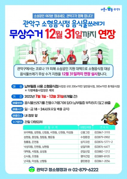 하지만 최근 사회적 거리두기 해제 등 방역지침 하향에 따른 각종 지원사업 종료, 대출상환 임박 등 소상공인의 경제적 어려움이 지속되는 상황을 고려해 음식물쓰레기 무상수거를 12월 31일까지 추가 연장하기로 결정했다.