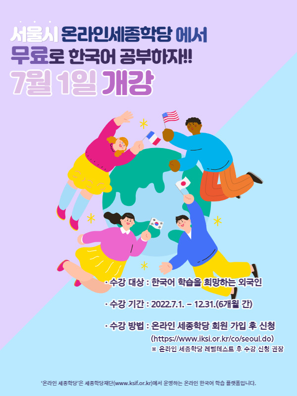 ‘서울시 온라인세종학당’은 시설 이용이 어려운 외국인주민을 위해 스마트폰이나 컴퓨터만 있으면 시간과 장소에 구애받지 않고 한국어를 공부할 수 있도록 만든 자가학습형 한국어 학습 플랫폼이다.