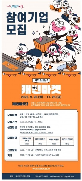 서울시는 오는 9월~11월 온라인 기획전‘가치소비는? 캐빈마켓’을 개최한다며 이와 관련해 오는 7월 15일까지 ‘캐빈마켓’에 참여할 사회적경제기업 100팀을 모집한다고 밝혔다.