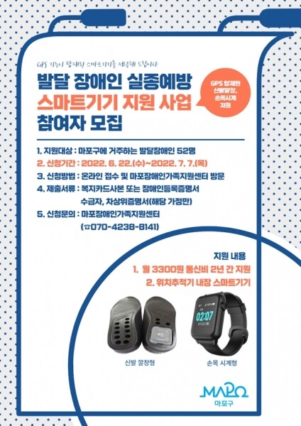 지원 대상은 마포구에 거주하는 발달장애인 52명으로 기존 실종 이력이 있거나 기초생활수급자 등 저소득층 또는 휴대폰이 없는 발달장애인을 우선해 지원할 방침이다.