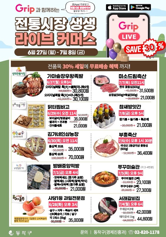 참여를 원하는 주민은 스마트폰 앱스토어 또는 플레이스토어에서 어플리케이션 ‘그립’을 내려받아 설치 후 검색창에 ‘전통시장 생생 라이브커머스’를 검색하면 실시간 판매행사에 참여할 수 있다.