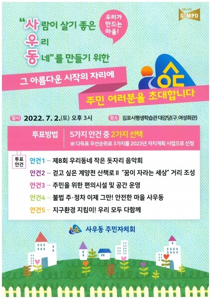 주민총회란, 주민들이 발굴한 우리동 사업을 서로 논의해 주민투표를 통해 결정하는 주민자치 실현의 장으로 마을탐방 및 주민 만나기를 통해 발굴한 마을 의제를 가지고 주민들의 의견을 수렴하고 취합해, 사전 설문조사 결과 최종 5가지 안건이 선정됐고2차례에 걸쳐 진행된 주민 사전투표 결과와 7월 2일 김포시 평생학습관에서 개최되는 ‘2022년 제2회 사우동 주민총회’ 현장 투표 결과를 합쳐서 우선순위 3위까지를 2023년 자치계획 사업으로 선정할 예정이다.
