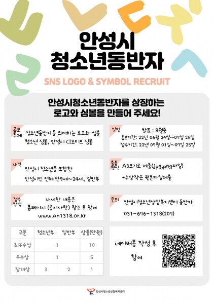 조화제 안성시청소년상담복지센터장은 “이번 공모전을 통해 안성시청소년상담복지센터가 위기청소년을 위한 찾아가는 상담서비스인 ‘청소년동반자’ 프로그램을 운영하고 있다는 것이 많은 사람들에게 알려지길 바란다”며 “청소년을 사랑하는 안성시민이라면 누구나 참여할 수 있는 만큼, 많은 관심과 참여를 바란다”고 말했다.