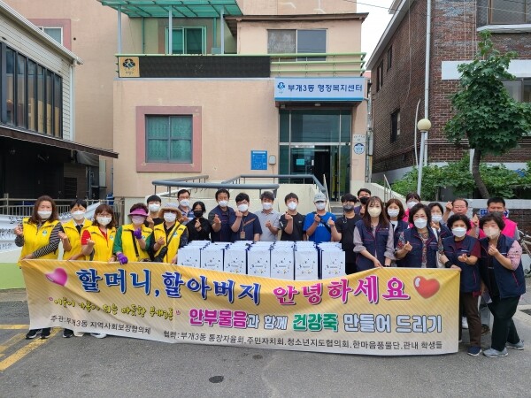 ‘건강 영양죽’ 지원사업은 지난해에 이어 올해도 추진하는 ‘부평구 마을공동체 만들기 공모사업’의 일환으로 지난 4월부터 매월 홀몸노인들에게 ‘건강 영양죽’을 지원하고 있다.
