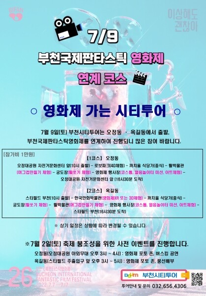 또한, ‘영화제 가는 부천시티투어’는 각각 오정동, 옥길동에서 출발해 한국만화박물관, 한옥체험마을 등을 관광한 후, 영화제 축제장 바리월드 페스티벌을 비롯해 다양한 영화제 부대행사에 참여할 수 있도록 코스를 구성했다.