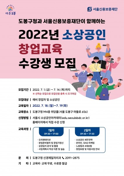 이번 창업교육은 7월 18일 9시 30분부터 오후 5시까지, 7월 19일 9시 30분부터 오후 5시 30분 이틀간 도봉구청 위당홀에서 실시된다.