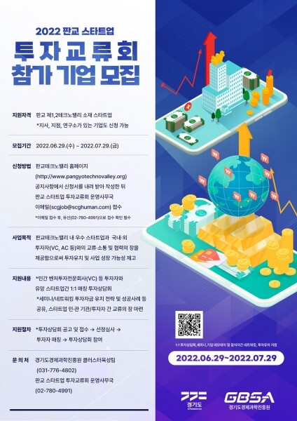 모집 기간은 6월 29일부터 7월 29일까지이며 지원신청은 판교테크노밸리 홈페이지 공지사항에서 신청서를 내려받아 작성한 뒤 판교 스타트업 투자교류회 운영사무국 이메일로 접수하면 된다.