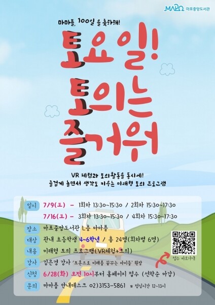 접수는 마포중앙도서관 홈페이지 문화행사마당의 ‘독서·문화프로그램’에서 온라인으로 할 수 있으며 선착순 마감이다.