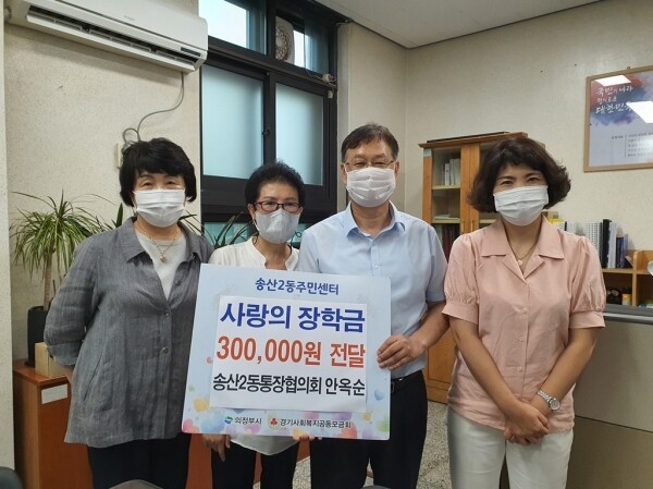 이종일 송산2동장은 “항상 좋은 나눔으로 이웃사랑을 실천하는 안옥순 통장님께 깊이 감사드리며 기부해 주신 장학금은 도움이 필요한 가구에 전달해 지역사회의 인재 양성을 위해 사용하겠다”고 감사의 마음을 밝혔다.