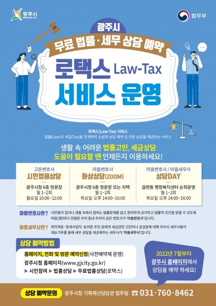 시 관계자는 “7월부터 광주시 홈페이지를 통해 운영되는 로택스 예약 서비스에 광주시민 여러분의 많은 관심과 참여를 부탁드린다”며 “일상생활에서 발생하는 법률·세무 문제와 관련해 시민들의 권리를 보호하고 양질의 무료 법률·세무 상담 서비스를 받을 수 있도록 최선을 다하겠다”고 말했다.