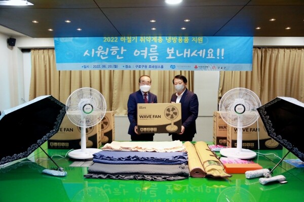 지난 20일 구로나눔네트워크가 취약계층을 위해 선풍기, 여름이불 등 냉방용품 5종 1,300개를, 13일 글로벌금융판매가 수제소면세트 500개를 기부했다.