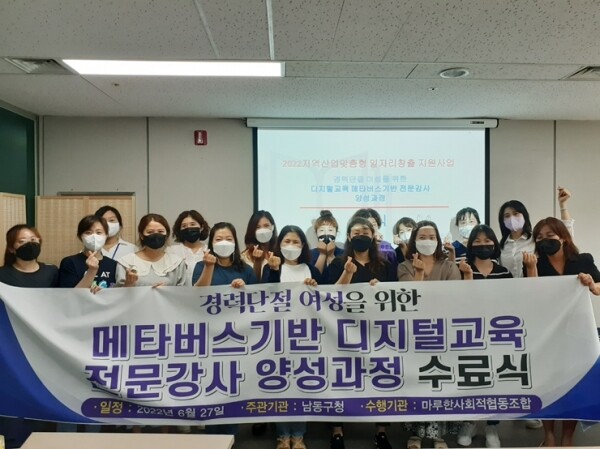 남동구가 주관하고 마루한사회적협동조합에서 수행한 이번 강사양성 과정은, 육아와 출산 등으로 경력이 단절된 여성들을 대상으로 4차 산업혁명 시대에 필수적인 메타버스 기반 디지털 교육 강사양성을 목표로 개설됐다.