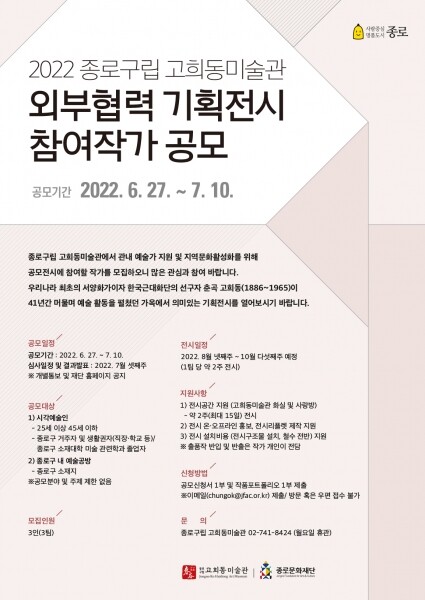참여 작가로 선정되면 고희동미술관 내 작품 전시공간과 함께 온·오프라인 홍보와 리플릿 제작, 전시 설치비용 등도 일부 제공받을 수 있다.