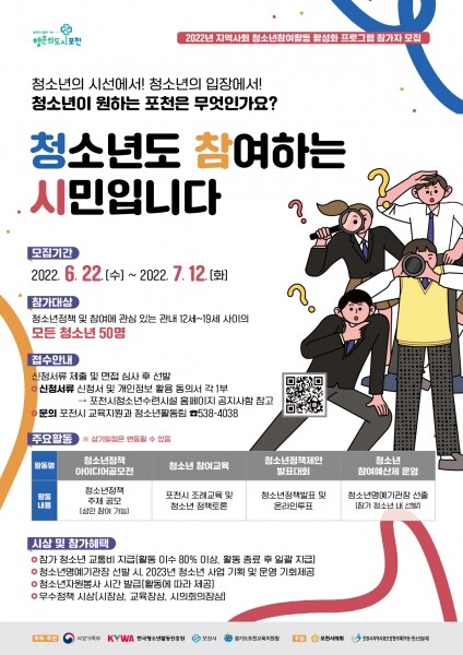 시는 ‘청소년도 참여하는 시민이다’라는 주제로 포천시 청소년정책에 대한 다양한 의견을 수렴하기 위해 아이디어공모전과 정책 및 조례교육, 선거교육 등 청소년에게 시민으로서의 교육 기회를 제공하고 청소년들이 민주시민 사회의 일원으로 청소년 정책을 직접 발굴한다.