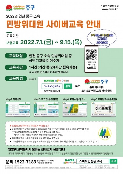 중구 관계자는 “민방위대원들의 편의와 안전한 교육을 위해 비대면으로 사이버 민방위교육을 진행하니, 많은 대원들의 참여를 당부드린다”며 “이번이 마지막 보충교육으로 교육 불참 시에는 민방위 기본법에 따라 불이익을 받을 수 있으니 유의해 주시기를 바란다”고 당부했다.