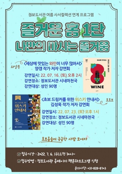 오는 7월 ‘즐거운 홈’ 1탄에서는 초보 홈술러를 위한 와인과 위스키에 관한 저자 강연회를 진행한다.