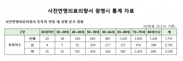지난해 광명시에서 실시한 웰다잉 정책제안 및 인식개선 연구용역 결과에 따르면 응답자의 40.5%가 사전연명의료의향서를 작성할 의향이 있다고 답했다.
