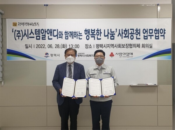 이날 협약식에는 시스템알앤디 박민수 대표이사와 평택시사회복지협의회 이영태 회장, 평택행복나눔본부 황성식 본부장을 비롯한 시스템알앤디 임직원들이 참여했다.