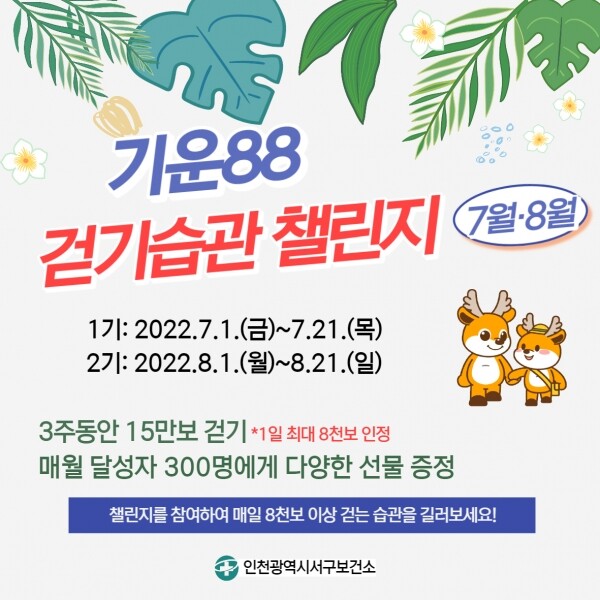 참여방법은 모바일 걷기 앱 ‘워크온’을 설치하고 ‘인천 서구 걷기 커뮤니티’에 가입 후 ‘기운88 걷기 습관 챌린지’를 선택하고 참여하면 된다.