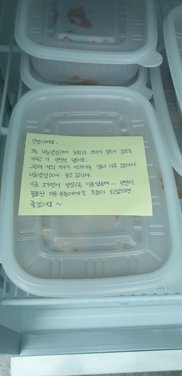 나눔 냉장고에 호박과 오이가 있어, 집으로 가져가서 반찬을 해왔다는 익명의 주민은 반찬이 필요한 이웃 분들에게 도움이 되었으면 좋겠다는 뜻을 밝혔다.