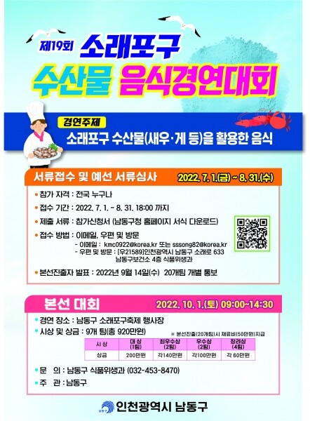 30일 구에 따르면 이번 대회는 2022년 소래포구 축제 기간인 10월 1일 열리며 요리에 관심 있는 사람이면 누구나 참여할 수 있다.
