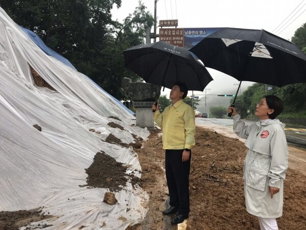 이어 남종면 삼성리 법면 유실 현장을 방문한 방 당선인은 유실 면적을 확인하고 추가 법면 유실 방지를 위한 응급조치 실태를 점검했다.