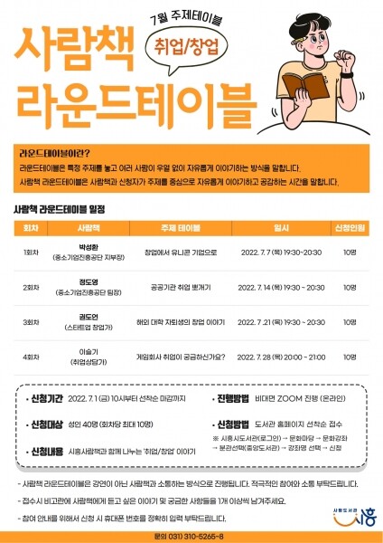 7월 ‘사람책 라운드 테이블’에 참여하고 싶은 시민은 7월 1일 오전 10시부터 시흥시 중앙도서관 홈페이지를 통해 신청하면 된다.