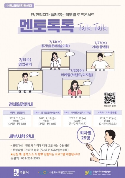 ‘전·현직자가 들려주는 직무별 토크콘서트-멘토톡톡’은 기업에서 실무를 담당하거나 담당했던 전·현직자들이 청년들에게 업무에 필요한 역량, 직무 장단점 등을 알려주는 프로그램이다.
