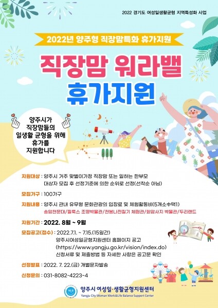 최종 선정된 직장맘 가족은 희망휴가일에 송암스페이스센터, 필룩스 조명박물관, 천봉나전칠기 체험관, 양주시립회암사지박물관, 두리랜드 등 총 5곳의 문화체험과 관람할 수 있도록 입장료와 체험비를 지원받는다.