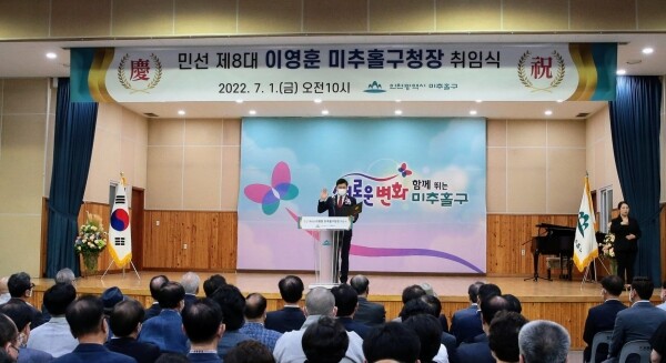 민선8기 시작을 알리는 타악 퍼포먼스 공연을 시작으로 미추홀구에 바라는 구민들 희망과 축하 메시지를 담은 동영상, 미추홀구립 여성합창단 축가 등 행사와 함께 이영훈 구청장 취임선서와 취임사, 각계각층 축하 메시지와 축사가 이어졌다.