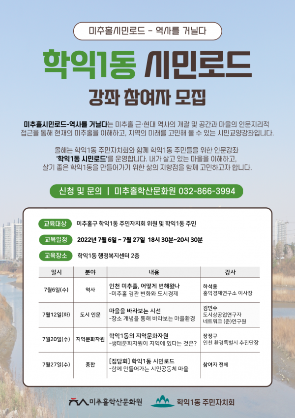 [뉴스써치] 미추홀학산문화원은 인천 미추홀구 학익1동 주민자치회와 함께 학익1동 주민들을 대상으로 시민강좌 ‘학익1동 시민로드’를 운영한다.