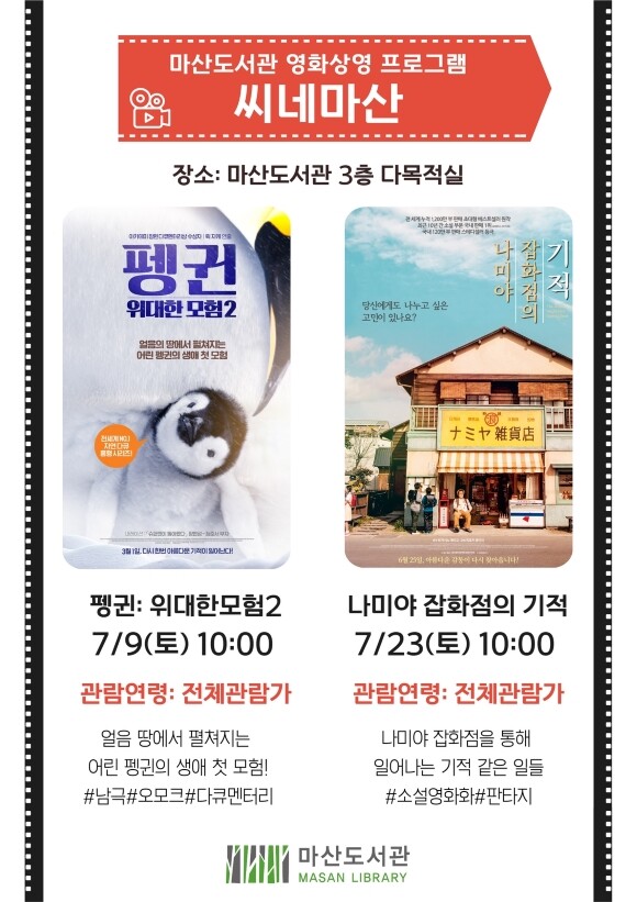 [뉴스써치] 김포시 마산도서관은 2022년 7월부터 매월 둘째·넷째주 토요일 오전 10시에 3층 다목적실에서 ‘씨네마산’을 운영한다.