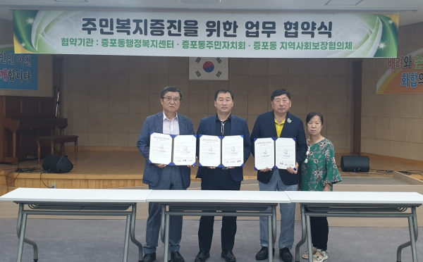 이날 협약을 체결한 이후성 협의체위원장과 최경래 주민자치회장은 “이번 협약으로 증포동민 스스로 증포동의 다양한 문제를 살피고 해결할 수 있는 기회를 마련하겠다”며 앞으로의 의지를 입모아 밝혔으며 이태영 증포동장은 “증포동의 복지 발전을 위해서 민간부분의 역할이 특히나 중요해진 만큼, 앞으로도 민관 협력체계 구축을 위해 주민력 지원과 보건·복지서비스 전달에 최선을 다하겠다”고 전했다.