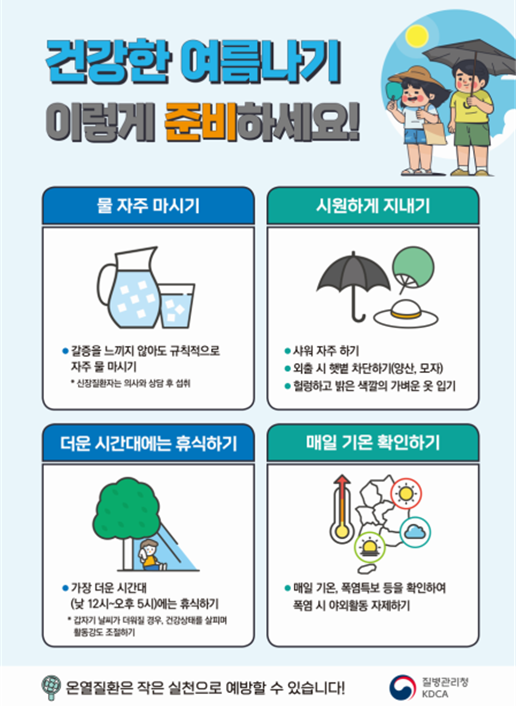 폭염으로 인한 건강피해는 건강수칙을 지키는 것만으로도 예방이 가능하므로 물 자주 마시기, 더운 시간대에는 휴식하기 등 건강수칙을 준수하는 것이 중요하다.