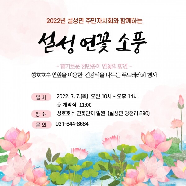 그 시기에 맞춰 올해는 7월 7일 1일간 에 설성면주민자치회에서 시민들을 위해 연잎을 이용한 여름 건강식을 직접 준비해 대접하는 푸드테라피 행사를 진행한다.