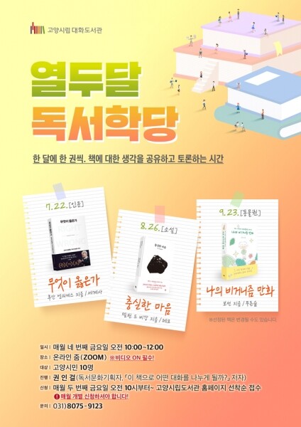 프로그램 참가는 각 달마다 개별 신청해야하며 매월 두 번째 금요일 오전 10시부터 고양시립도서관 홈페이지에서 할 수 있다.