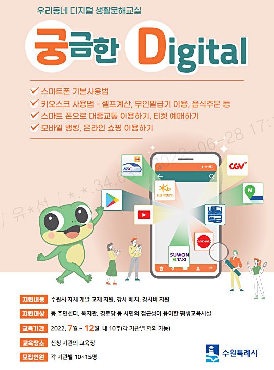 수원시가 자체적으로 개발한 교재 ‘궁금한 Digital’와 지난해 운영한 ‘평생교육 전문가 양성 과정’, ‘디지털 생활문해강사 역량 강화 과정’ 등을 통해 양성한 전문 강사를 활용해 질 높은 교육을 제공한다.